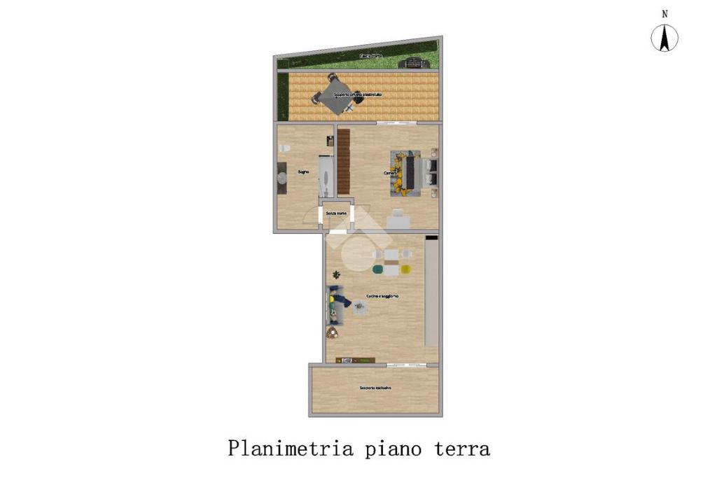 Si accede direttamente dal giardino tramite ingresso indipendente e successivamente sulla zona giorno con angolo cottura tramite portoncino d'ingresso in triplo vetro antisfondamento. Nella zona notte troviamo un bagno finestrato con doccia ed una camera matrimoniale con accesso diretto sul giardino.
