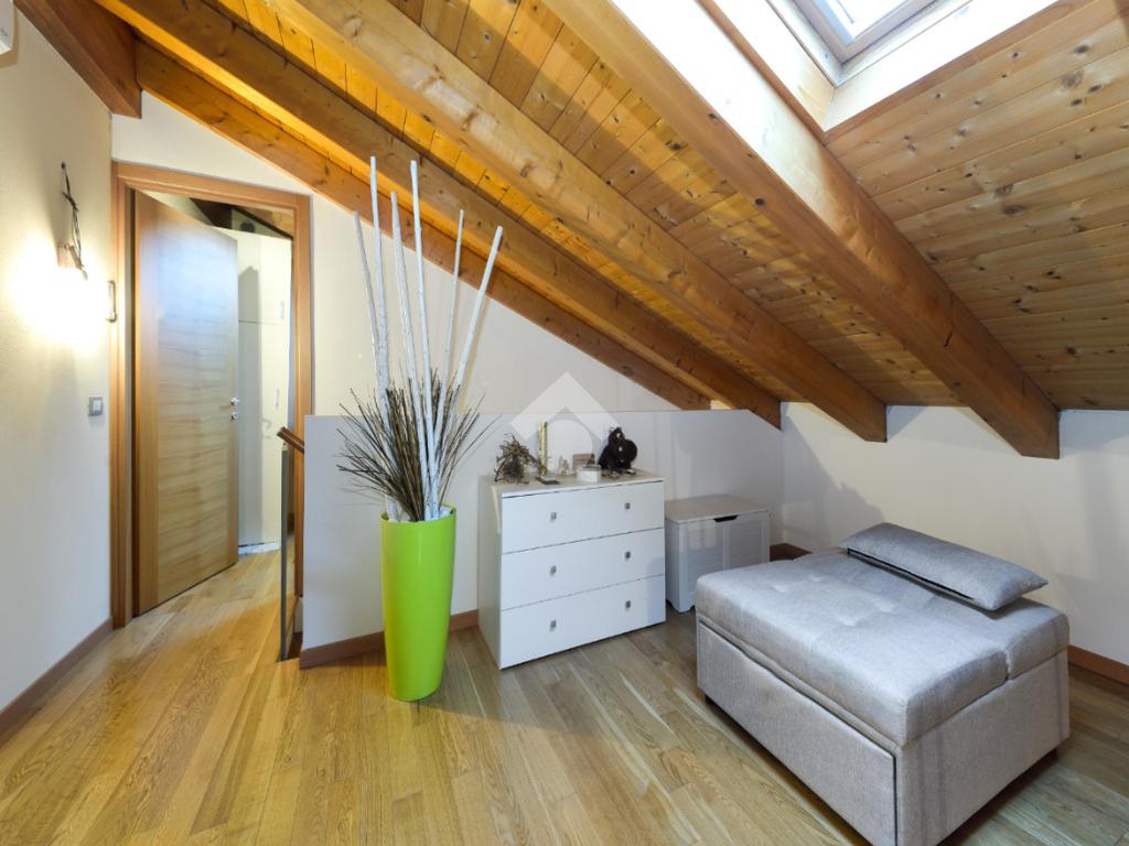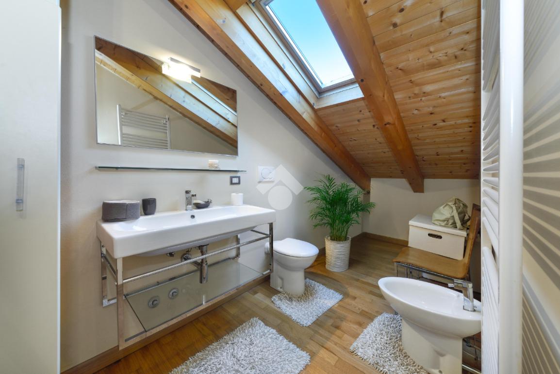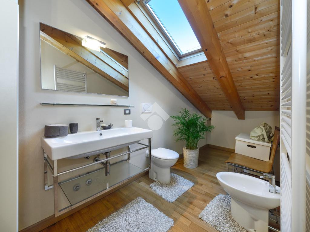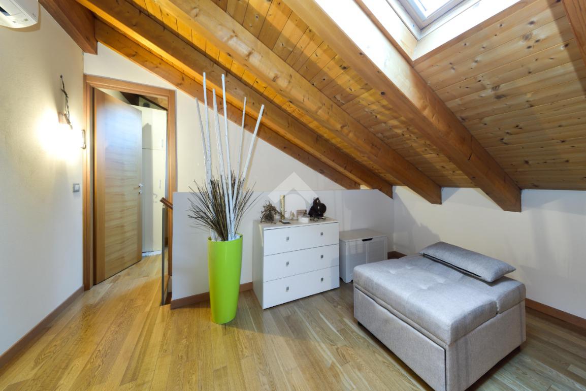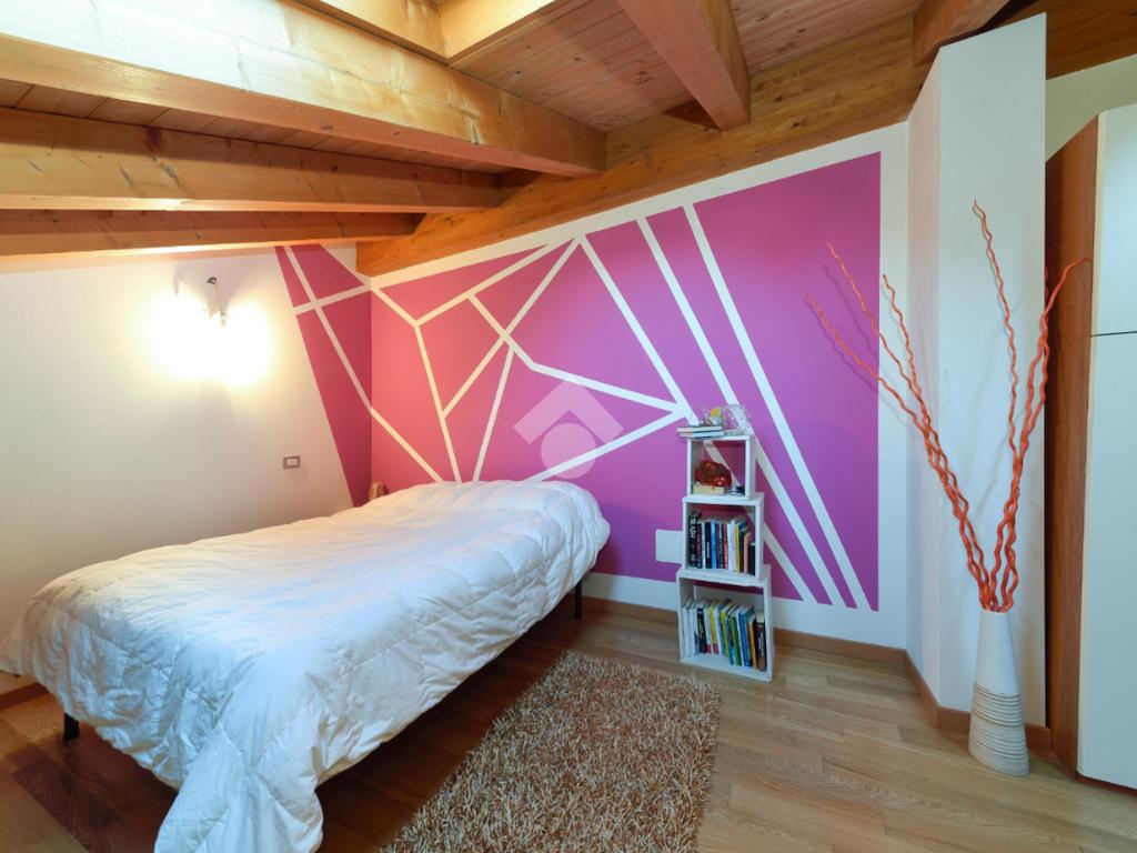 Salendo al piano superiore si accede all'ampia camera con travi a vista. Completa il piano un secondo bagno finestrato con doccia anch'esso travato.