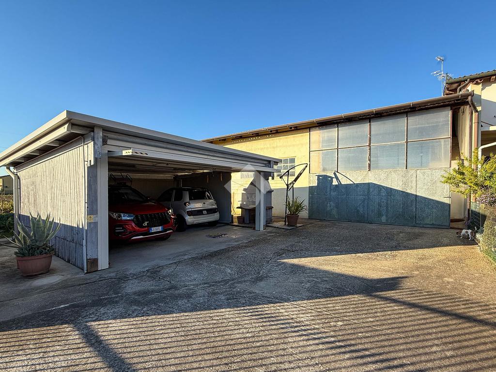 A completare la soluzione oltre al ricovero attrezzi di circa 250 mq, troviamo anche due posti auto coperti da una pompeiana.